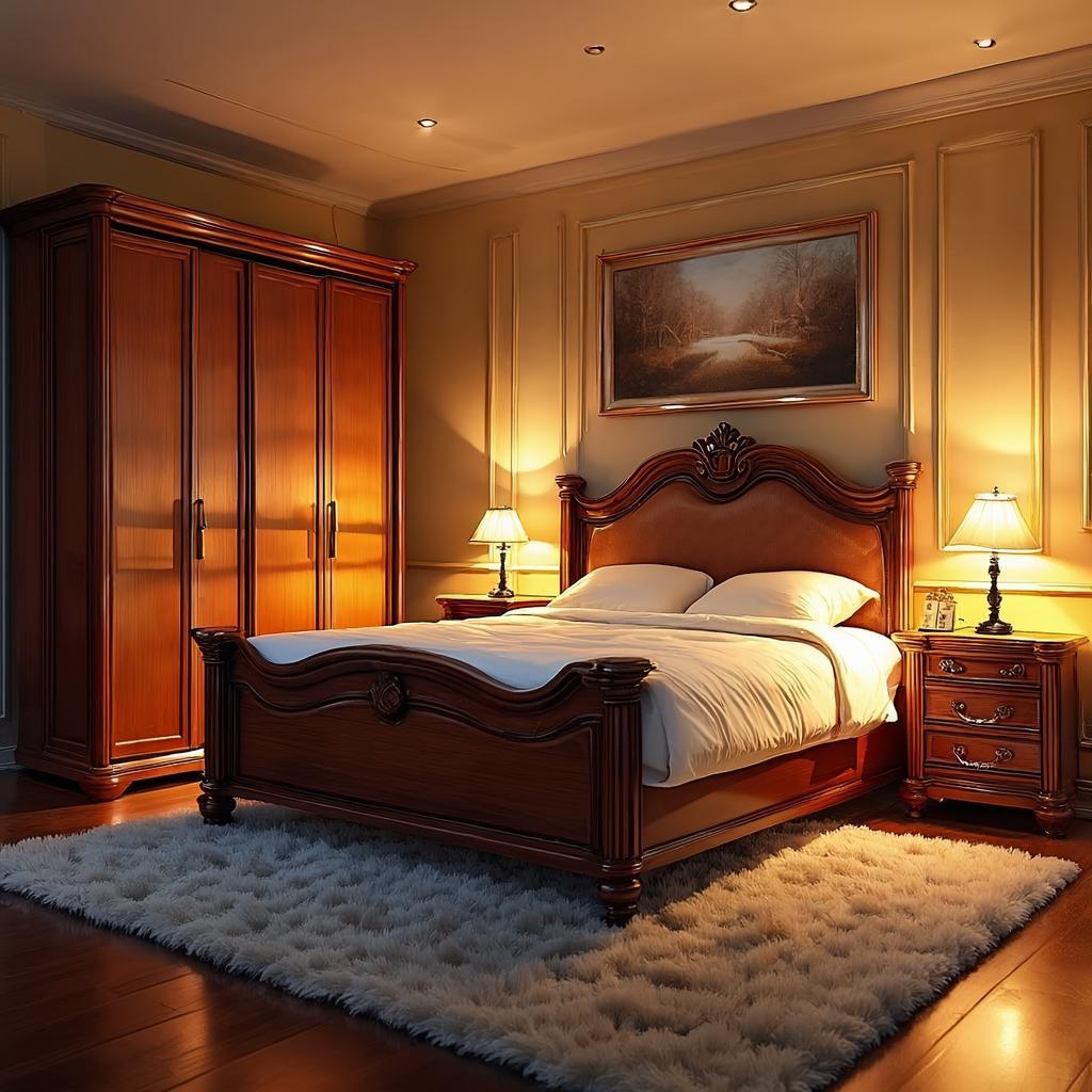 Set kamar tidur lengkap dengan tempat tidur, nakas, dan lemari pakaian