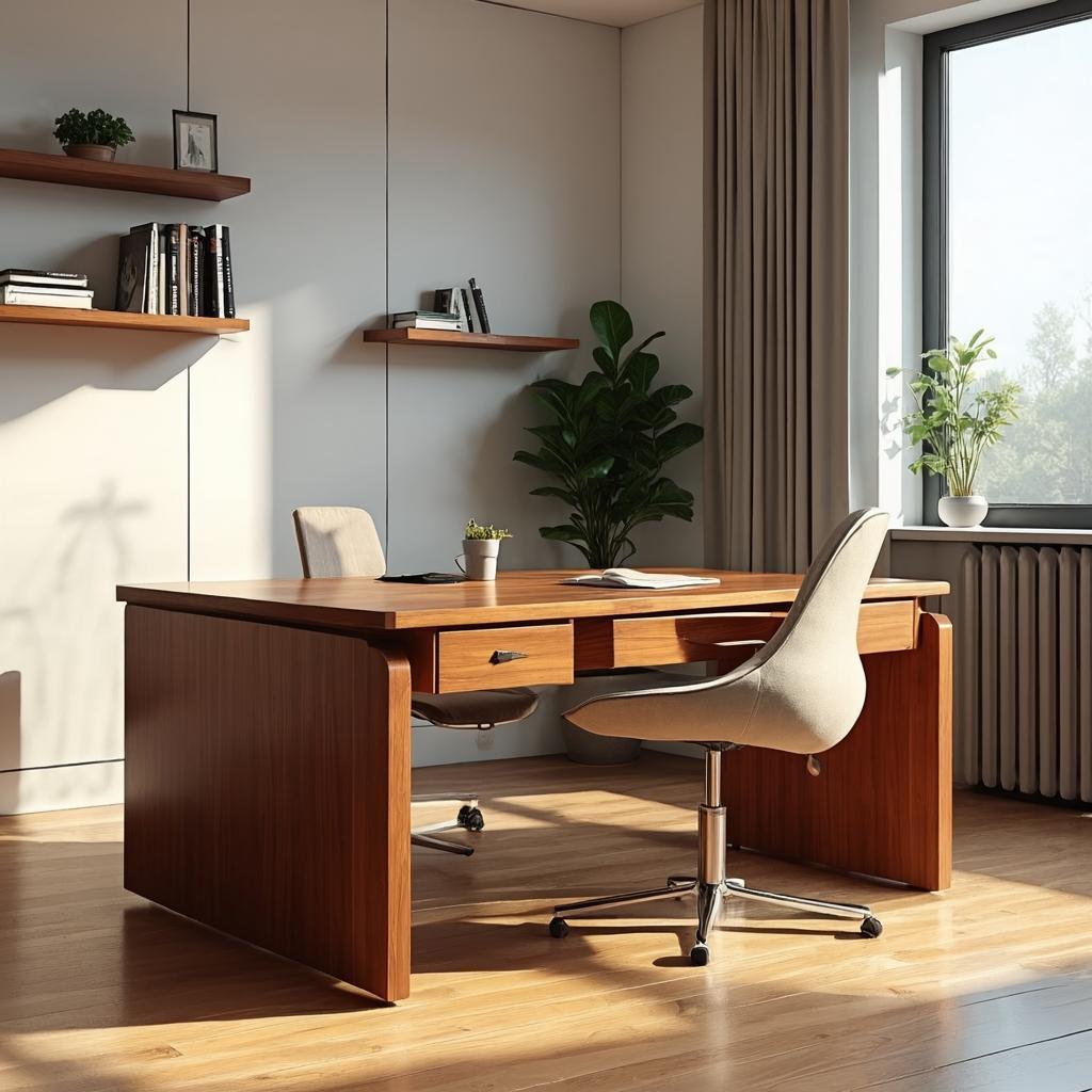 Meja kerja elegant dengan kursi ergonomis, sempurna untuk home office